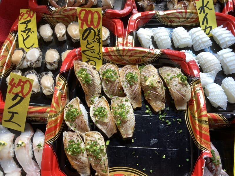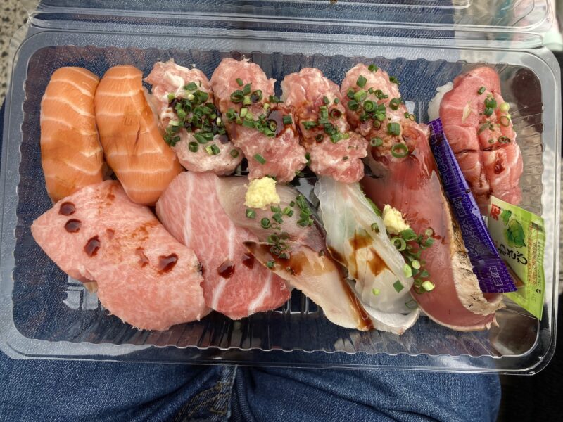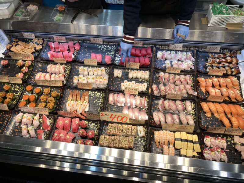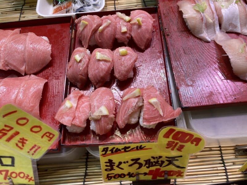 本来、活きいき馬関街は一貫ずつ売ってあるのが主流ですが、一斉セールに突入すると売れ残ったお寿司をパック売りしてありました。